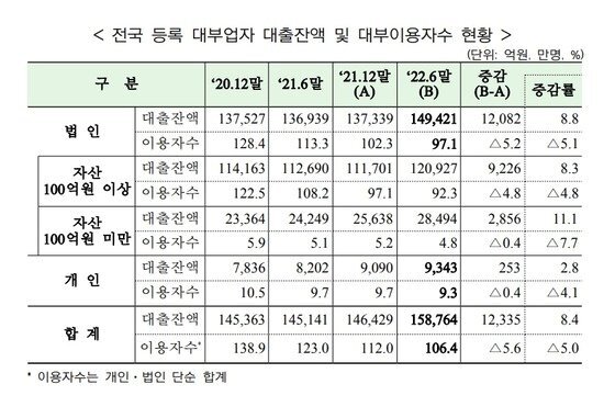 28일 금융감독원에 따르면 지난 6월 말 기준 대부업자의 대출잔액은 15조 8764억 원으로 지난해 말(14조 6429억 원) 대비 1조 2335억 원 증가했다.